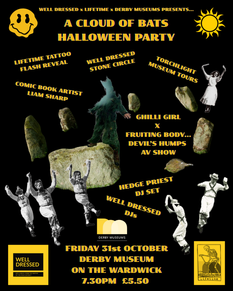 “Expect trad-folk put through a blender of techno, DnB and breakbeat, with mind-bending visuals, as Ghilli Girl and Fruiting Body debut their new AV show. We’re excited to be hosting Birmingham’s Hedge Priest for their Derby debut, fresh from supporting slots with duo Stick In The Wheel and Goblin Band, who will be playing an eclectic mix of techno and acid house, alongside some ‘folk-adjacent’ hardtek and breakcore. Rounding out the evening will be an opening set from Well Dressed DJs, laying down a suitably atmospheric Giallo-inspired opening set.”