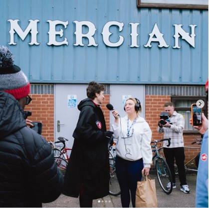Image: BBC Radio Derby’s Becky Measures interviews Greg James at Mercian Cycles during his ‘Longest Ride’ challenge for BBC Comic Relief