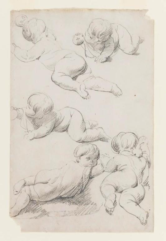 Five studies of a crawling baby (Anna Romana), pencil on paper, 1774-5, offers perhaps the most intimate window into Wright’s personal life in section four; the drawings show Wright tenderly responding to his new baby daughter, who was born on 24 June 1774 during his honeymoon in Italy. His subsequent letters home are also full of observations, often humorous, illustrating the happiness of a proud new father. Wright’s studies of sculpture during this time are equally infused with life, in particular Study of ‘The Barbarini Faun’, after the Antique, pen and brown ink over pencil on paper, dated 23 March 1775, which lays bare the sculpture’s latent homoeroticism.